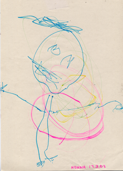 lettipäinen tyttö (äiti) istuu jakkaralla (4 v 4 kk)